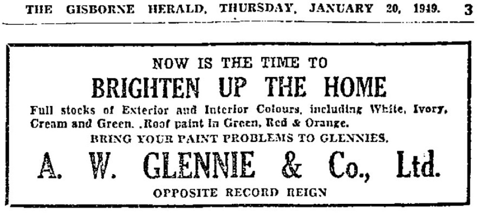 BELOW: An advertisement for A.W. Glennie & Co, the paint shop which Dean Hall's father Randall Hall ran on the corner of Glastone Road and Carnarvon Street.